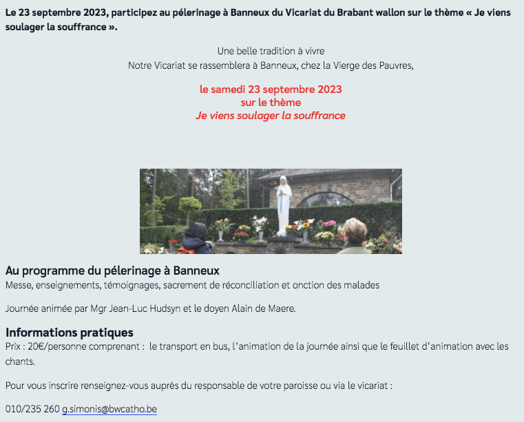 Pèlerinage à Banneux 2023 Le 31 août 20231 septembre 2023 par Evelyne Bosquéedans Activités des pôles, Église, Fêtes religieuses, Infos, Intergénération, Invitation..., Méditation, Prière, spiritualité, Suggestions Inscriptions avant le 8 septembre auprès de Gaëlle Simonis: g.simonis@bwcatho.be ou 010 235 260 Pour aller plus loin Plus d’infos sur Banneux Retrouvez un écho d’un ancien pèlérinage à Banneux Le Service de la Pastorale de la Santé Partager : Cliquer pour imprimer(ouvre dans une nouvelle fenêtre) Imprimer Cliquez pour partager sur WhatsApp(ouvre dans une nouvelle fenêtre) WhatsApp Cliquer pour envoyer un lien par e-mail à un ami(ouvre dans une nouvelle fenêtre) E-mail Cliquer pour partager sur X(ouvre dans une nouvelle fenêtre) X Cliquez pour partager sur Facebook(ouvre dans une nouvelle fenêtre) Facebook J’aime chargement…